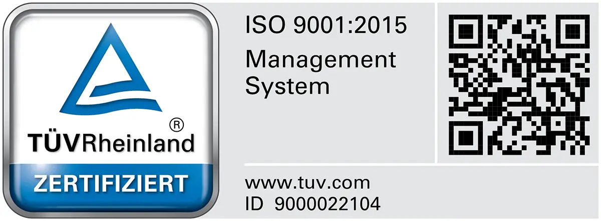 With our ISO 90001 certificate dated June 20, 2025, the accredited TÜV Rheinland Cert GmbH certifies conformity with the globally recognized standard ISO 9001:2015.